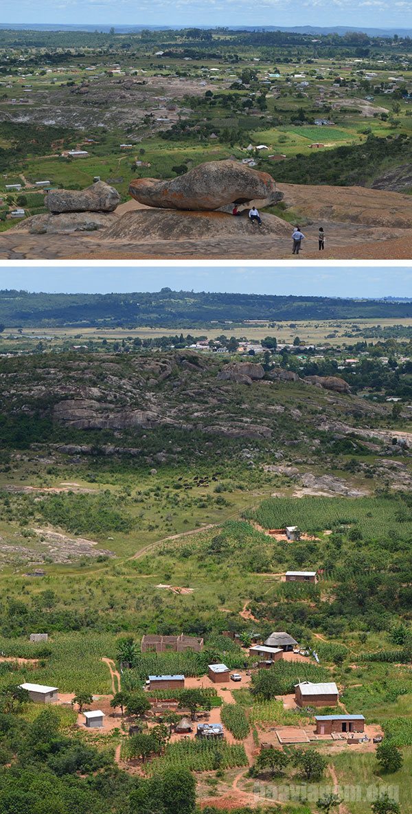 Logo na entrada de Domboshava existe uma grande floresta que é considerada “terra que não pode ser cultivada”. Há todo um mistério ao redor desse lugar, pois algumas histórias de antepassados relatam que as pessoas tentavam cortar as árvores dessa região para criar pequenos campos de cultivo, indo no final do dia de trabalho para suas casas e quando retornavam no dia seguinte, as árvores estavam lá novamente como se nada tivesse acontecido. Você pode perceber o tamanho da floresta e as dimensões da vista panorâmica do planalto central do Zimbabwe pela montagem a seguir: