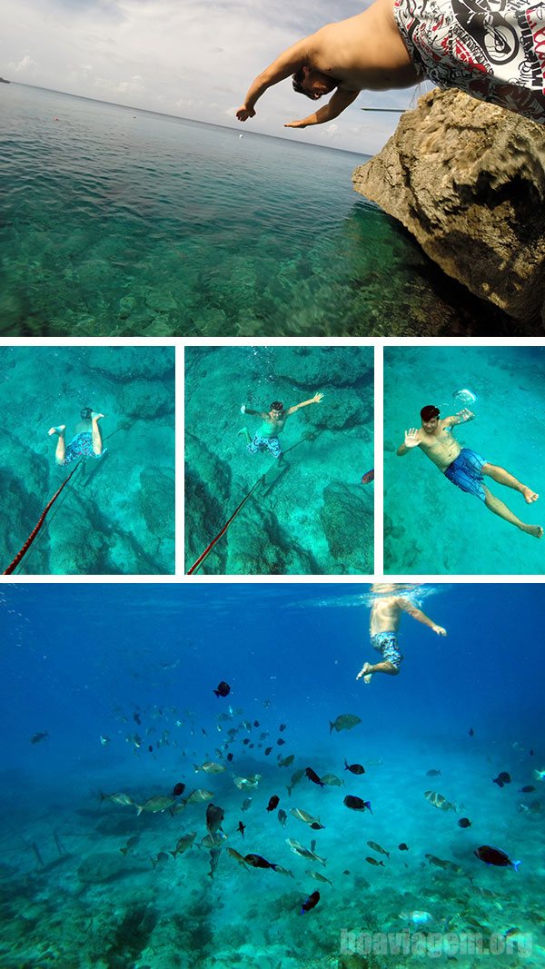 Como cada turista que entra leva um pedacinho de pão, e todos sem excessão jogam o este pedaço ao mar (mesmo sem dar um pulo daquele belo trampolim), os cardumes estão sempre presentes e o duelo pelas migalhas pode render fotos impressionantes 🙂